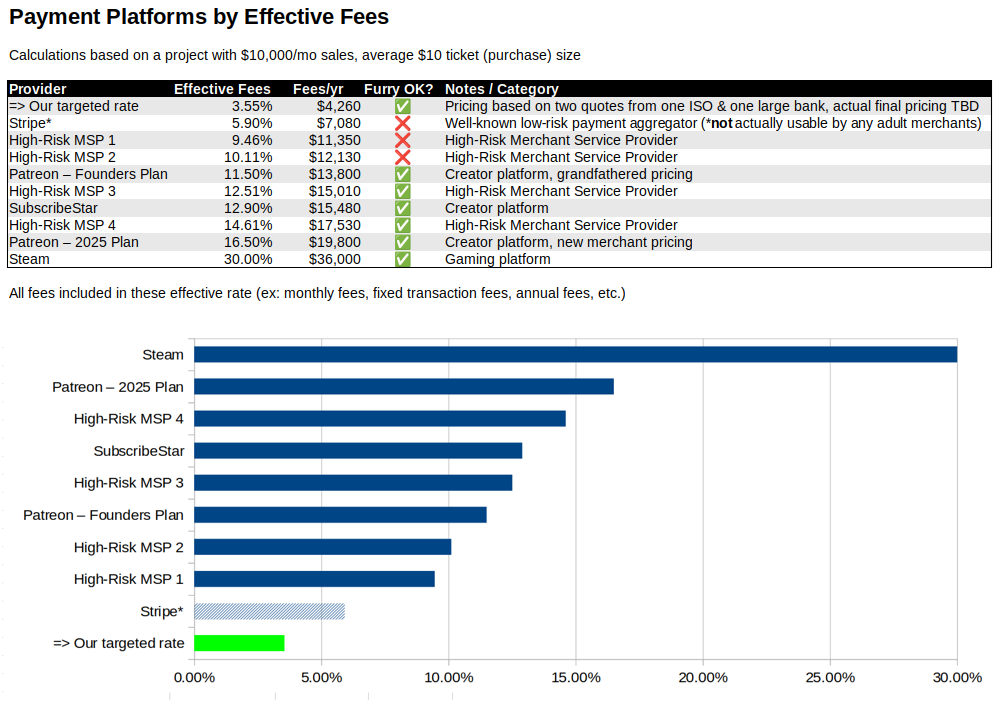 Even if this pitch fails, we may still be able to take our developer group to various ISOs and pitch starting a sub-ISO group. Or, with enough developers, we can take our group to the various sponsoring banks directly and pitch starting our own ISO if we have enough volume to justify it. The payments industry seems much more interested in talking to us as a large group versus as small individual merchants, which is basically why Patreon, Steam, SubscribeStar, etc are able to process payments but we struggle to do the same when we try to do this on an individual basis.